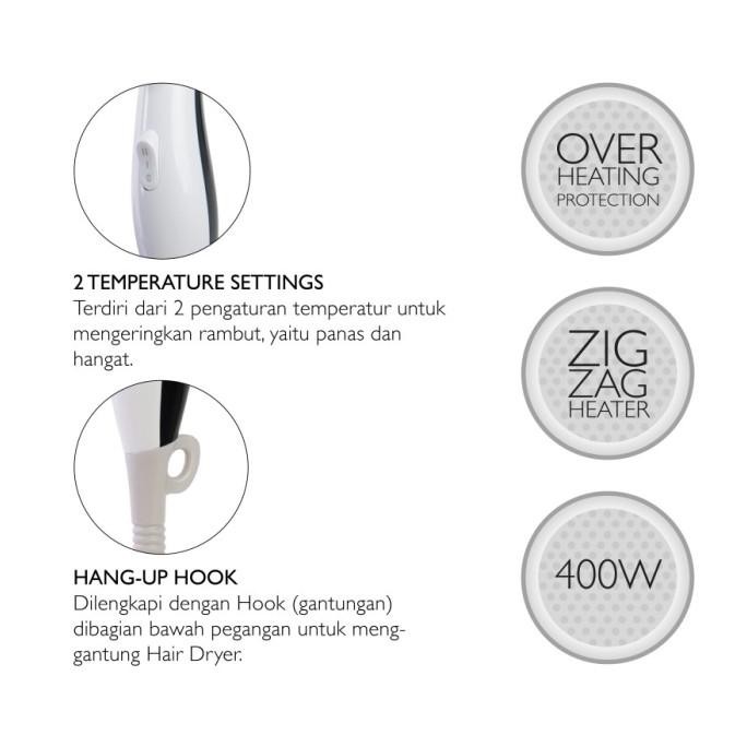 - Dilengkapi dengan Hang-Up Hook di bagian bawah pegangan untuk menggantung Hair Dryer