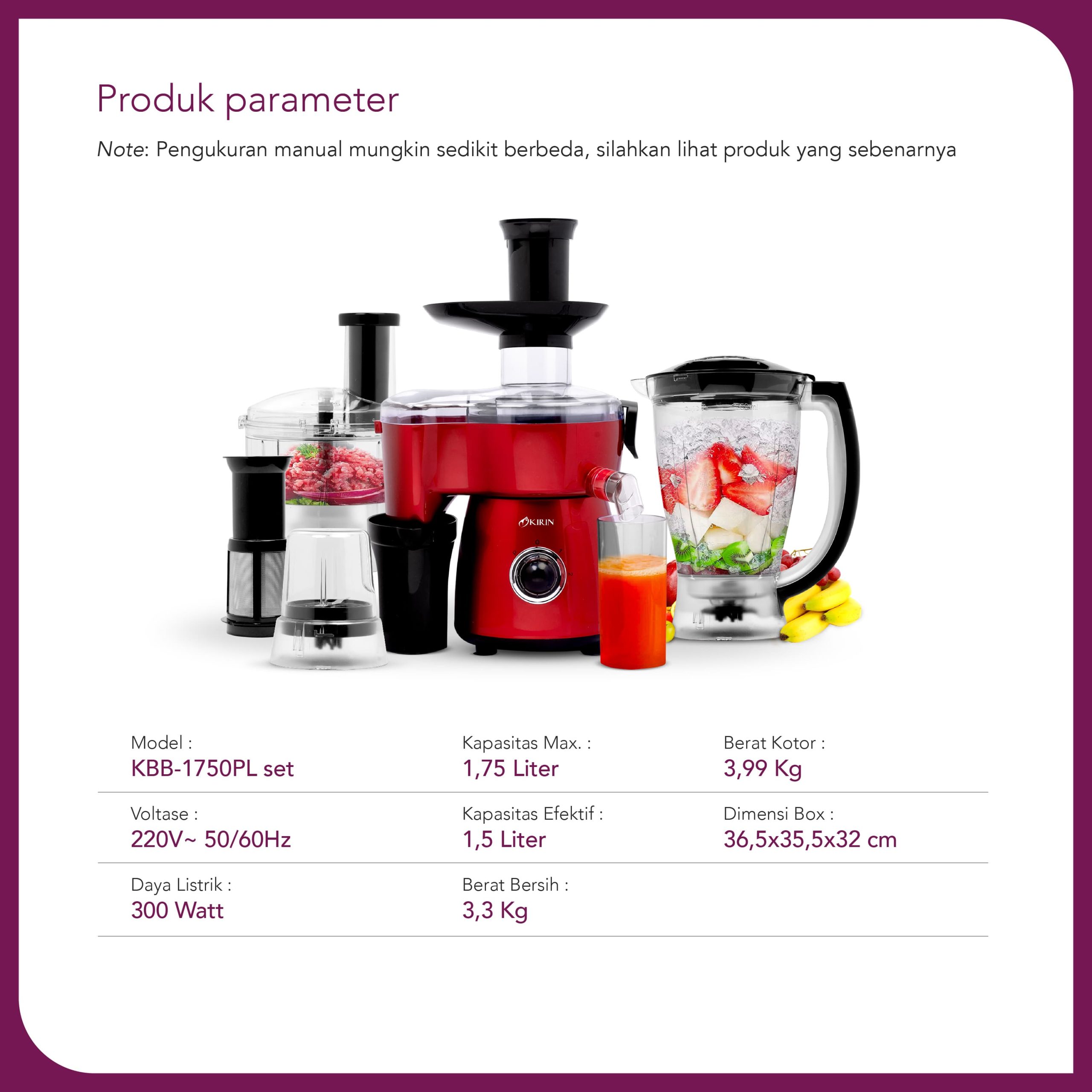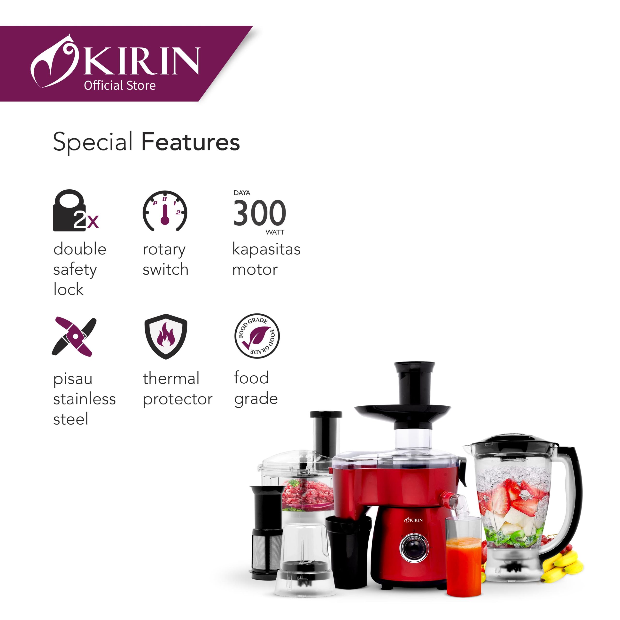 - Dilengkapi dengan Dry Mill, Filter Cup, Chopper, dan Juicer (Full Set)