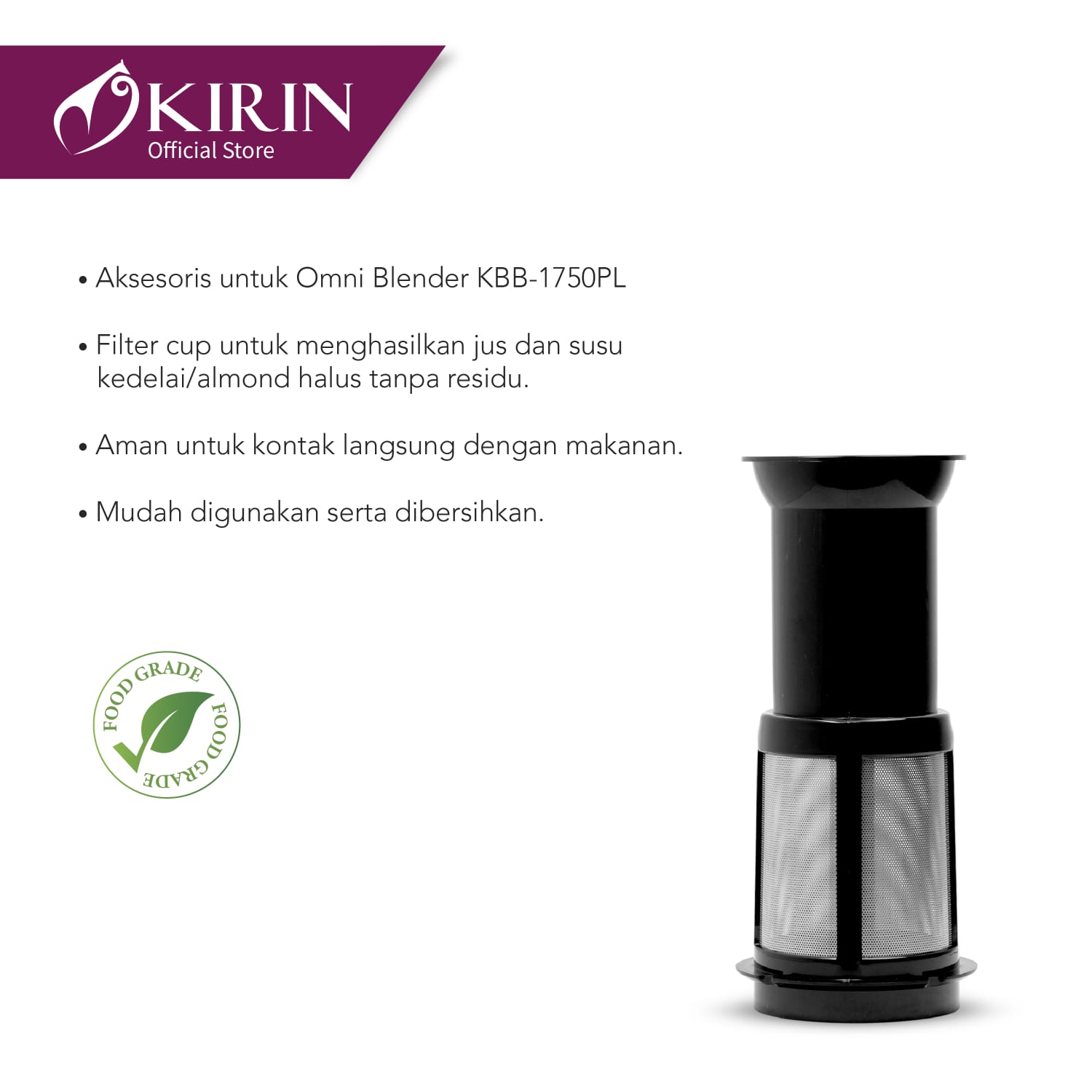- Filter Cup dapat dipakai untuk menghasilkan jus atau susu (kedelai, almond, dll) tanpa residu dan mudah dibersihkan