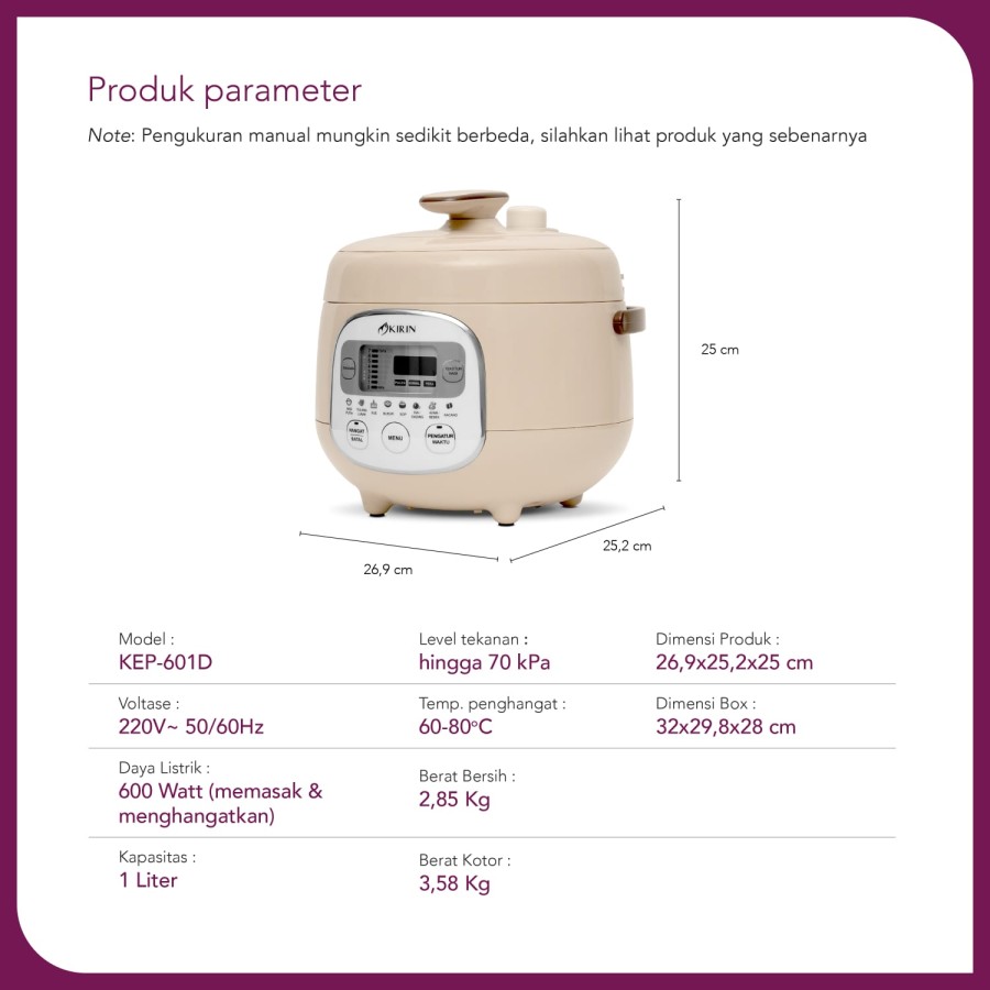 - Safe Pressure Release button untuk mengeluarkan uap sehingga aman saat memasak