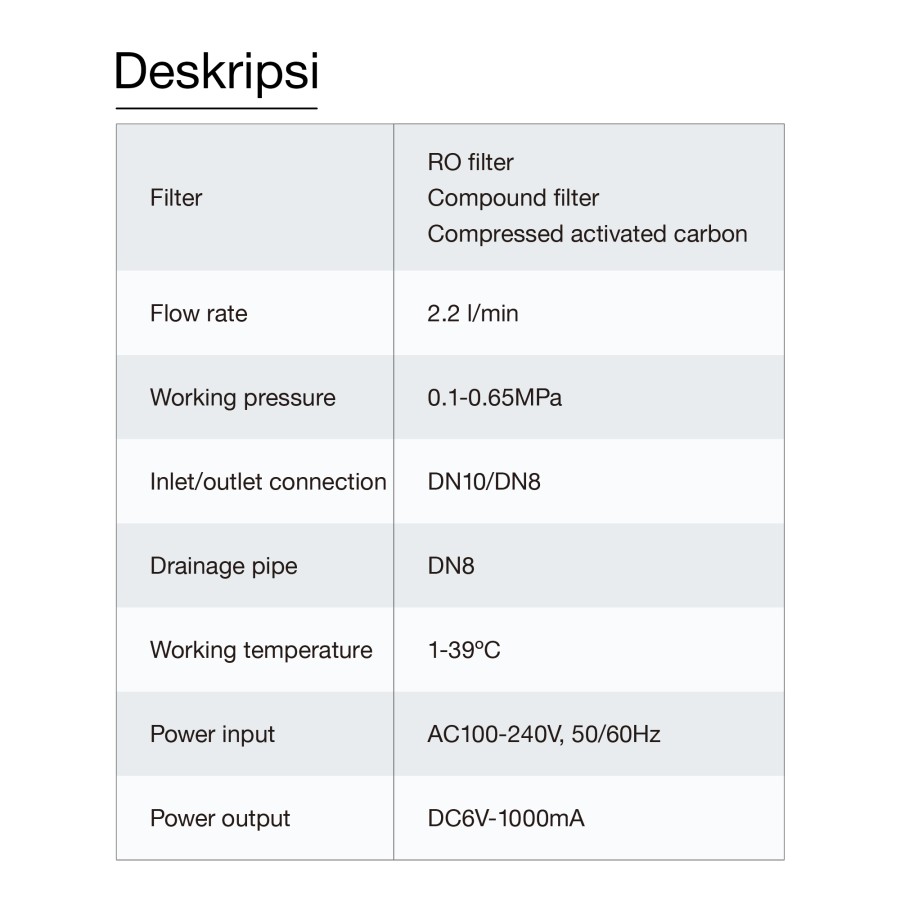 • Dapat dipasang di atas meja atau di bawah wastafel dengan instalasi yang mudah dan fitting konektor yang mudah disambung