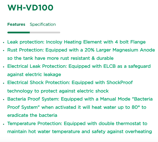 Bacteria Proof System: Dilengkapi dengan Digital Display dengan tombol yang mampu menaikkan suhu air hingga 75°C dengan satu kali tekan, untuk menghilangkan risiko berkembangnya bakteri legionella